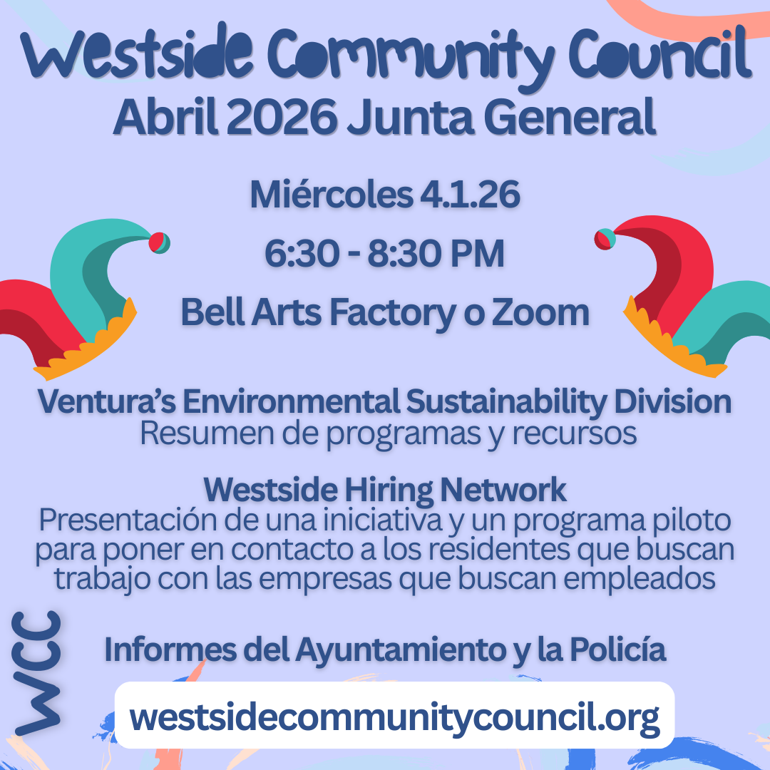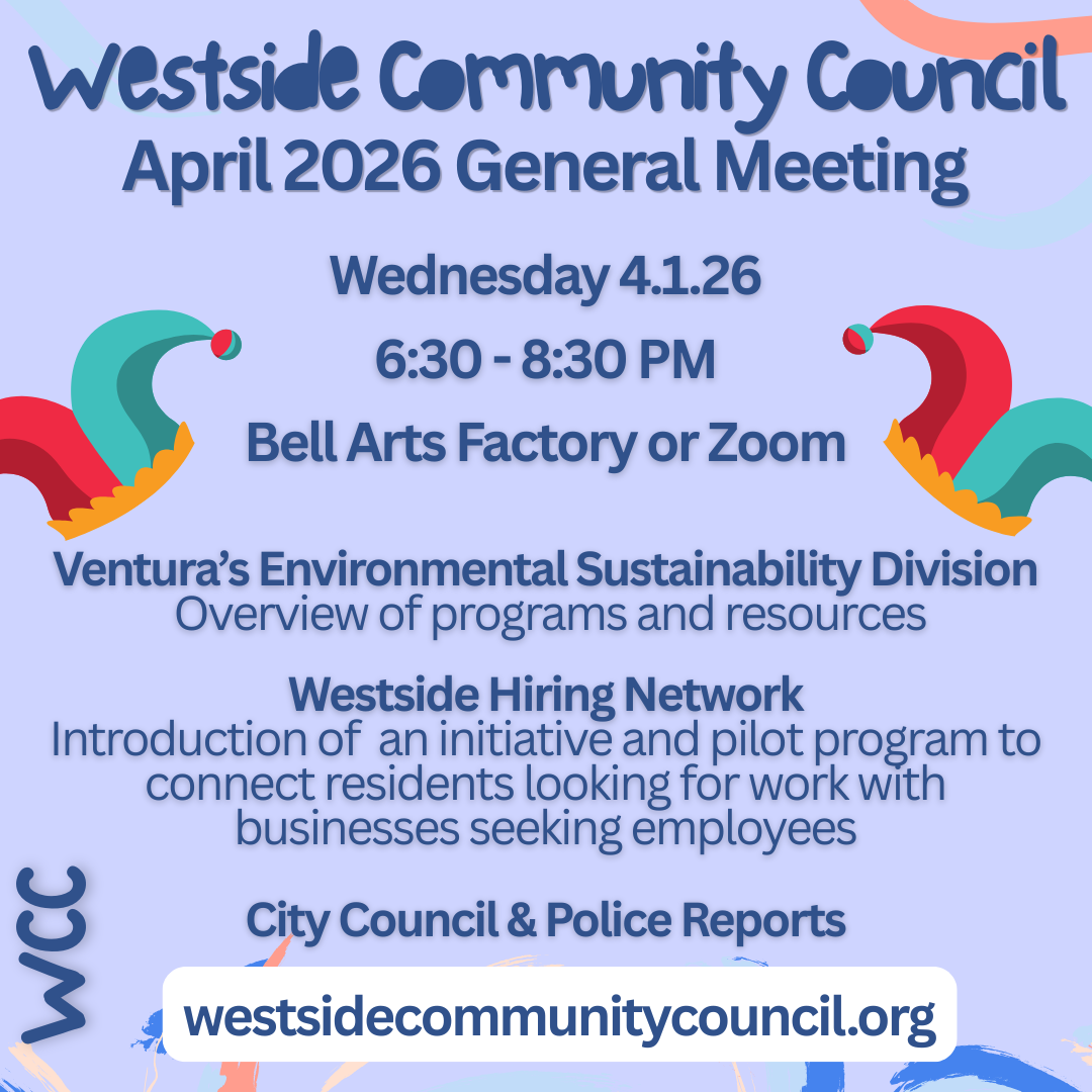 Today the Westside is home to 14,000-plus people, three schools, Westpark Community Center, Ventura Avenue Adult Center, Westside Resource Center, a police storefront, three parks, great restaurants, art galleries including the ever vibrant Bell Arts Factory and so much more! The Westside Community Council -- one of Ventura's six community councils -- formed in 1994 to build a better neighborhood.